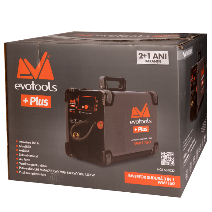 Разширете възможностите си за работа с инверторния апарат за заваряване EvoTools +Plus® WMI 160 – здрав, дигитален уред, проектиран за висока производителност. Този апарат "3 in 1" обединява процесите на заваряване MMA, MIG/MAG (с възможност за използване на самозащитна тел FCAW - No Gas) и TIG Lift, осигурявайки необходимата гъвкавост за работа с широка гама материали и дебелини.