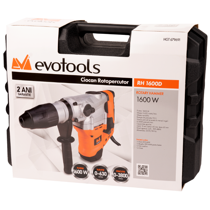 Перфораторът RH 1600D EvoTools® е идеалният инструмент pentru всички дейности по пробиване, ударно пробиване и къртене, оборудван с мощен мотор 1600 W и енергия на удара 9 J за безусилна работа.